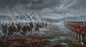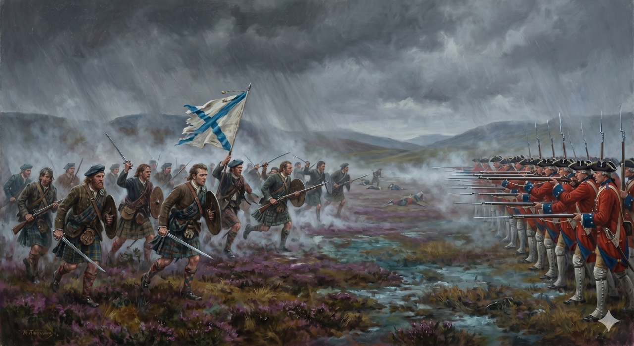 The Event: On April 16, 1746, the Battle of Culloden took place on Drummossie Moor near Inverness, Scotland. It was the final confrontation of the Jacobite Rising of 1745 and the last pitched battle fought on British soil. The Jacobite forces, primarily Scottish Highlanders supporting the claim of Charles Edward Stuart (“Bonnie Prince Charlie”) to the British throne, faced a well-equipped government army led by the Duke of Cumberland. This oil painting rendering captures the bleakness of the moor under a heavy, grey sky filled with driving sleet. Using soft, wet-on-wet washes of heather-purple, earthy brown, and cold blue, it depicts the desperate Highland charge through the mist, their banners tattered as they met the disciplined lines of red-coated bayonets.