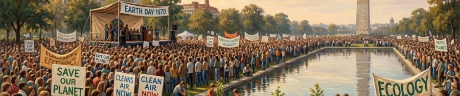 The Event: On April 22, 1970, the very first Earth Day was celebrated across the United States. Conceived by Senator Gaylord Nelson of Wisconsin and organized by activist Denis Hayes, the event aimed to promote ecology and raise awareness about rampant pollution. This historical moment is visualized in a realistic oil painting, which captures the massive, energized crowd gathered on the National Mall in Washington, D.C. In the mid-ground, thousands of diverse young people are seen near a temporary stage and the reflecting pool, with the Washington Monument rising under a soft, golden late afternoon sky. Faintly visible, hand-painted signs and banners made of fabric read “EARTH DAY 1970,” “SAVE OUR PLANET,” and “CLEAN AIR NOW.” The brushwork captures the textured, grassroots feel of the massive gathering, with smaller figures planting saplings in the foreground, underscoring the focus on collective action and environmental stewardship.